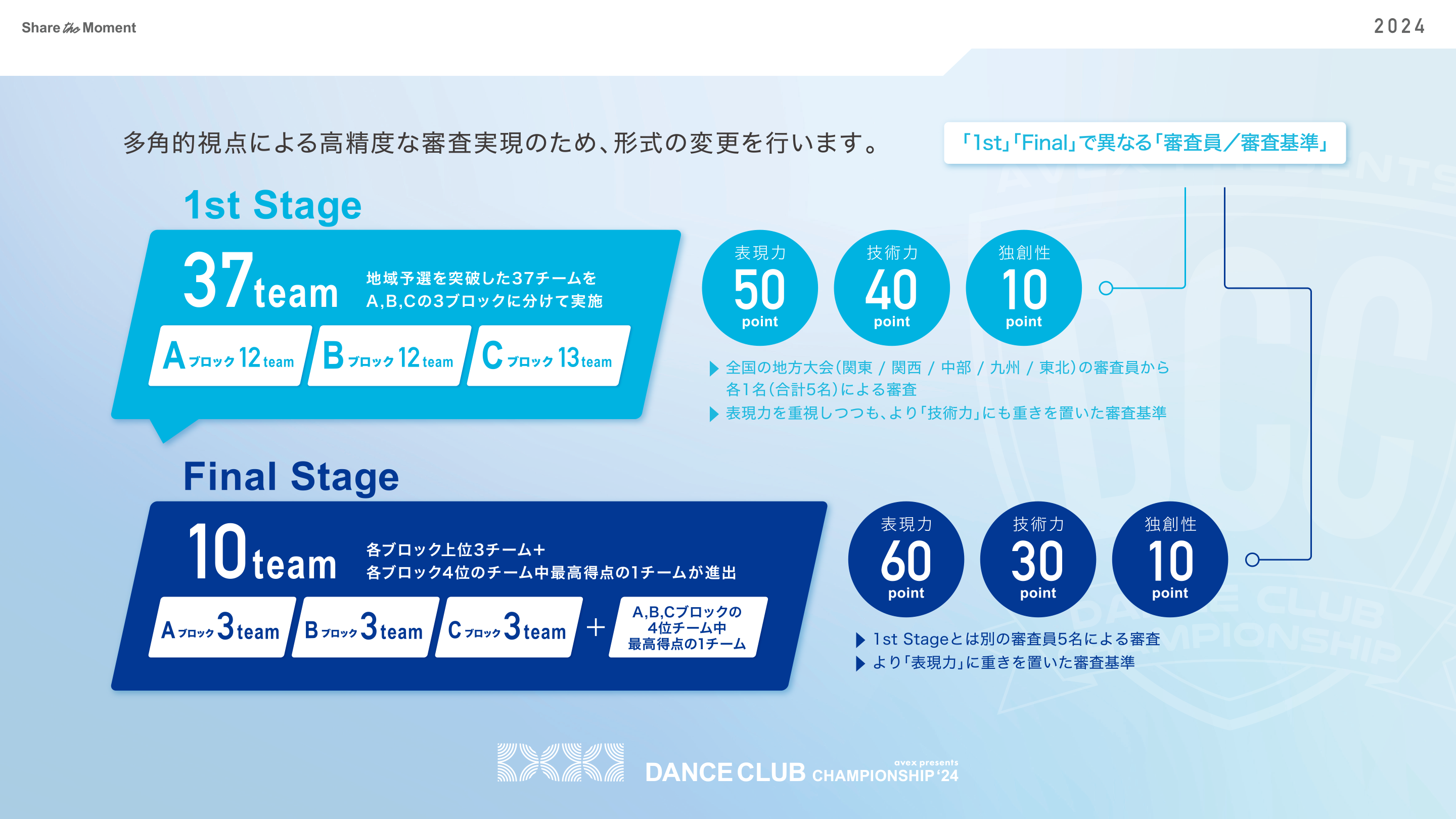 | 技術力 | 40点 | 30点 | 「リズムキープ力」「キレ / スピード / 力強さ / 柔軟さ」「シルエット」 「ユニゾン」「技」を総合的に審査 ※技に関しては個人技か?複合技か?、難易度、完成度、作品への調和感、等を総合的に審査します。 |